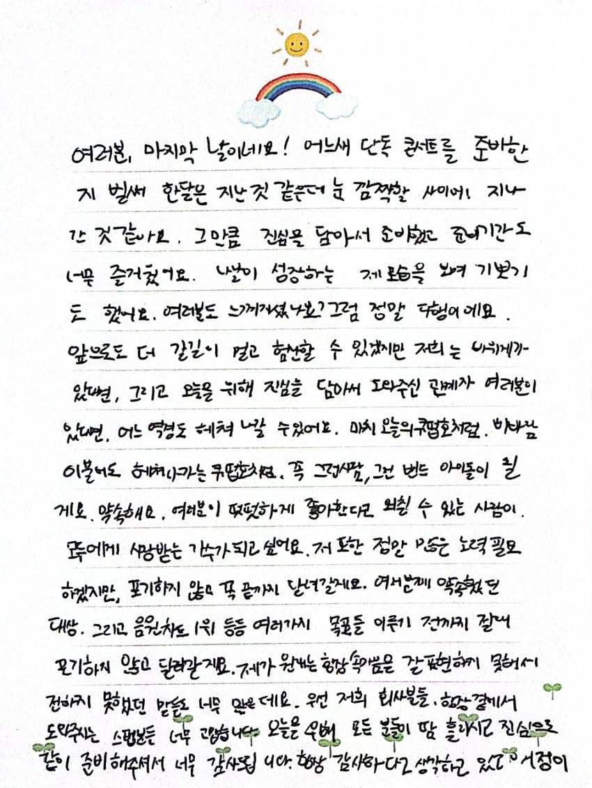 회사 관계자들, 바위게, 멤버들, 가족들에게 차례대로 감사를 표하는 시요밍의 예쁜 마음이 지렁이 글씨체로 편지지를 파고들어 갔더군요. 급속히 찌그러지는 글씨들 가운데에서도 "너무 사랑합니다! 또 만나요!"만큼은 알아볼 수 있게 적었으니, 합격! 저 또한 하루빨리 시요밍을 다시 만나고 싶습니다.