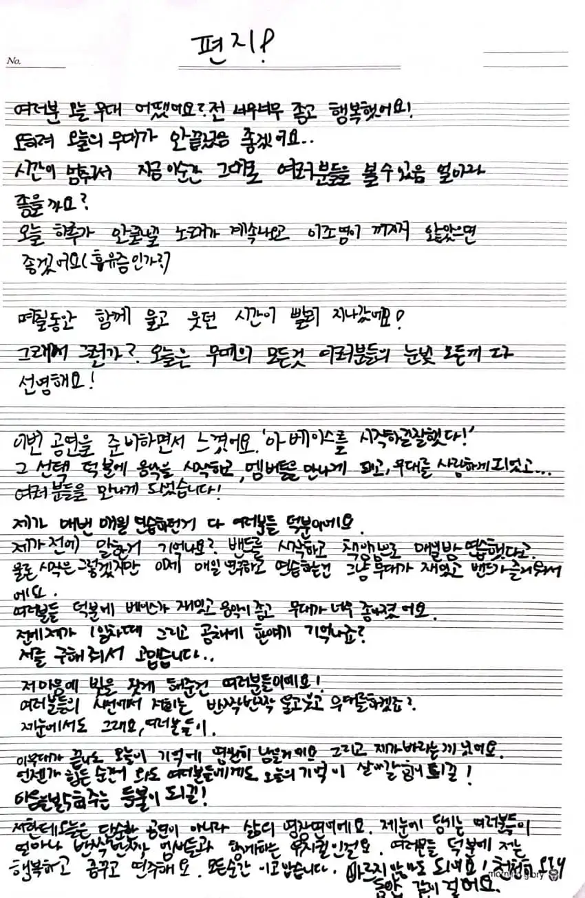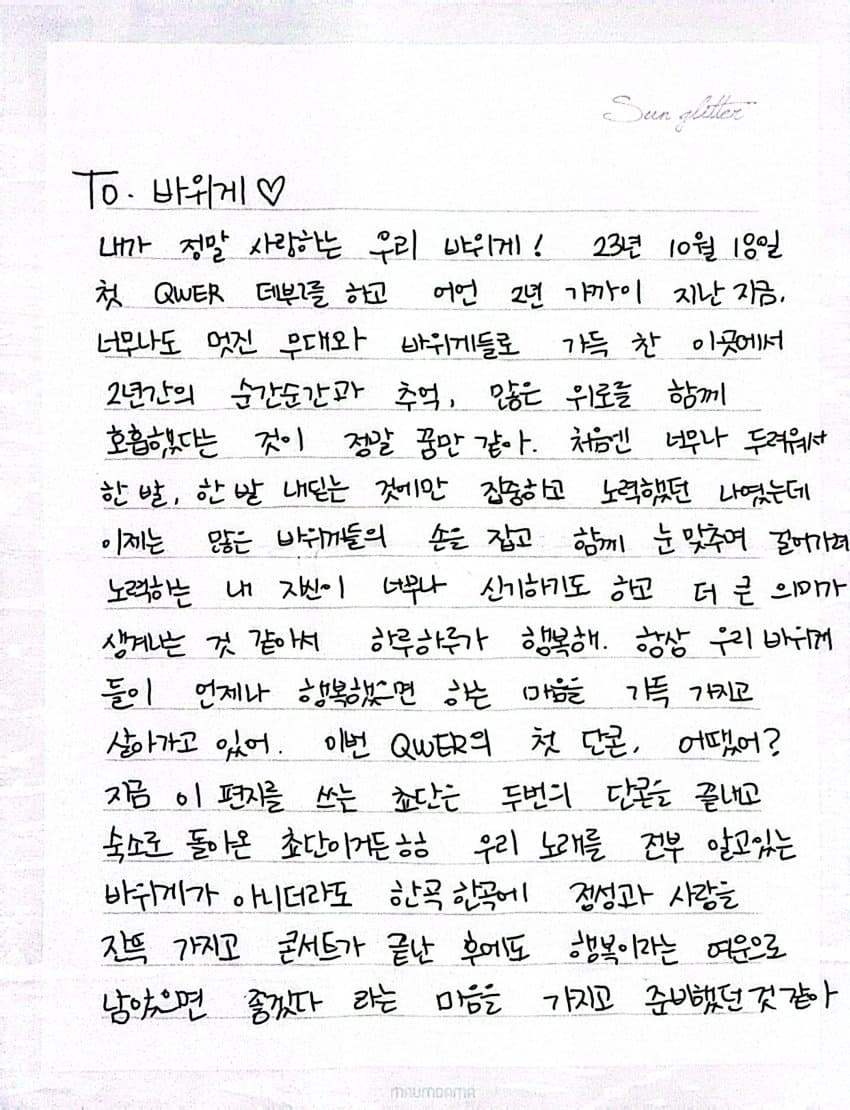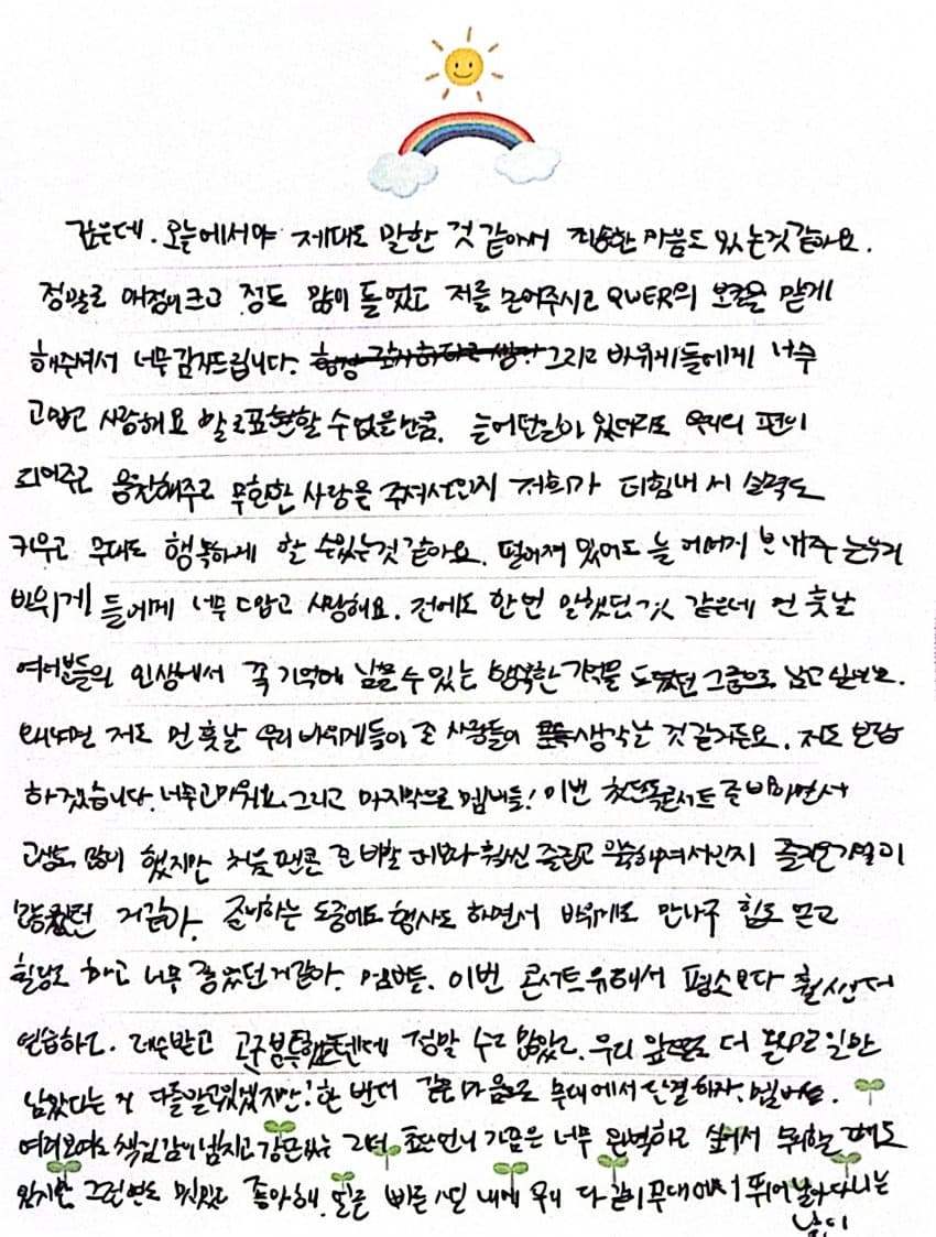 그런데 10월 5일 마지막 콘서트에서는 <청춘서약> 공연 후에 QWER이 직접 쓴 손편지가 공개되었습니다. 그녀들이 들고 나와 직접 읽었죠. 전날 밤이나 당일 새벽에 썼다는 것을 보니, 저와 비슷한 생각을 했던 누군가가 제안을 하지 않았나 싶습니다. 울보 순서대로 읽었으니, 젠타부터 시작해야겠죠? 다행히 QWER 매니저인 '율율'이 공식 팬카페에 사진 이미지 파일을 올려주었습니다. 직접 보는 편이 나을 듯하여, 그대로 게시합니다.