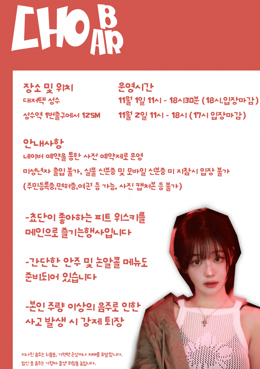 저도 바위게지만, 솔직히 바위게 좀 멋진 것 같습니다. 술을 좋아하는 가수는 많지만, 내 가수를 위해 위스키바를 가수 생일날에 오픈하는 팬덤은 여태껏 없었습니다. 돈이 문제가 아니라 그런 아이디어 자체를 내지 못했으니까요. 역시 사회 경험이 풍부한 남초 팬덤답습니다. 저도 위스키바를 손꼽아 기다리는 중인데요. 다음 글에서는 술 냄새가 좀 많이 날지도 모르겠습니다.