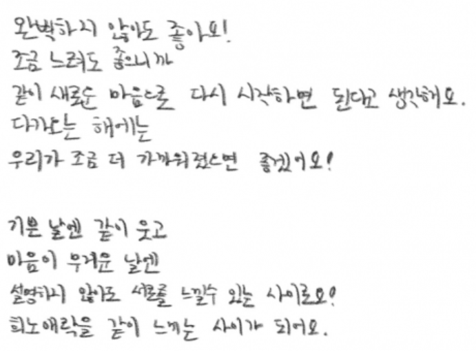 새해 첫 날 젠타가 바위게들에게 쓴 편지 내용처럼, 완벽하지 않아도 좋으니 함께 느리게 걸으면서 희노애락을 공유하는 QWER과 바위게가 되었으면 좋겠습니다. '느리게 함께 걷기'는 '혼자서 남보다 빨리빨리'에 중독된 현대 사회, 특히 무한경쟁과 승자독식으로 병든 대한민국을 치유할 귀한 한 마디입니다.