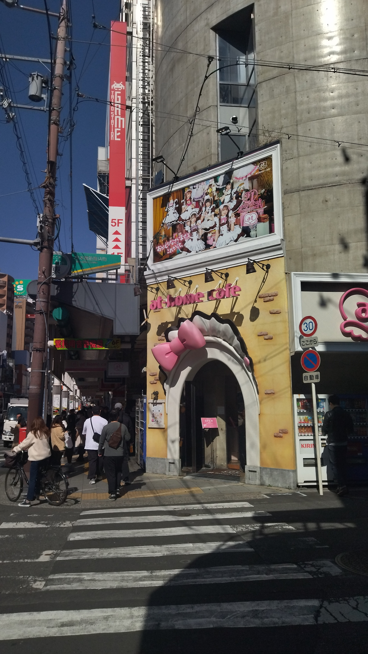 오사카 전자상가 쪽을 부지런히 걸으며 이것저것 사 먹던 3명의 바위게, 아직 점심식사조차 하지 않았습니다. 제일 처음 지나친 곳은 QWER의 보컬 시요밍이 일했던 메이드 카페 '앳홈(at home).' 수줍은 소녀 감성의 우리들은 그곳을 방문할 생각이 없었습니다. 다만 그 앞을 서성이다, 다른 바위게들을 만났습니다. '앳홈'에 들어간 일행 바위게들을 기다리는 중이더군요. 그런데 '앳홈'에서 눈치 빠르게 QWER의 <고민중독>을 틀어놓고 있답니다. '참으로 대단한 바위게!'란 생각이 들었습니다.