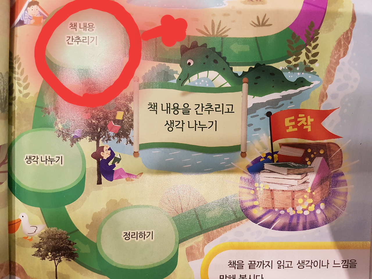 '책을 읽고 생각을 나누어요'라는 대 제목 안에 세 가지 소제목이 세 개가 있었다. 그 세 부분은 읽을 책을 정하고 내용 예상하기, 인상 깊은 내용을 정리하며 책 읽기, 마지막으로 책 내용 간추리고 생각 나누기였다. 그중에 가장 관심이 갔던 부분은 ' 책 내용 간추리기' 부분이었다.
