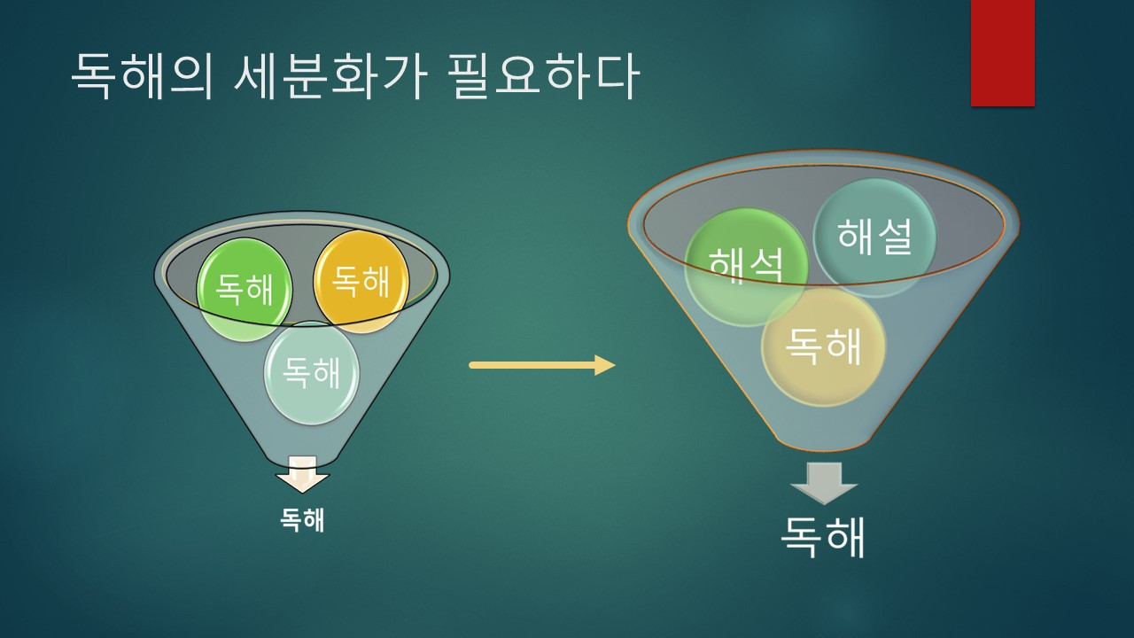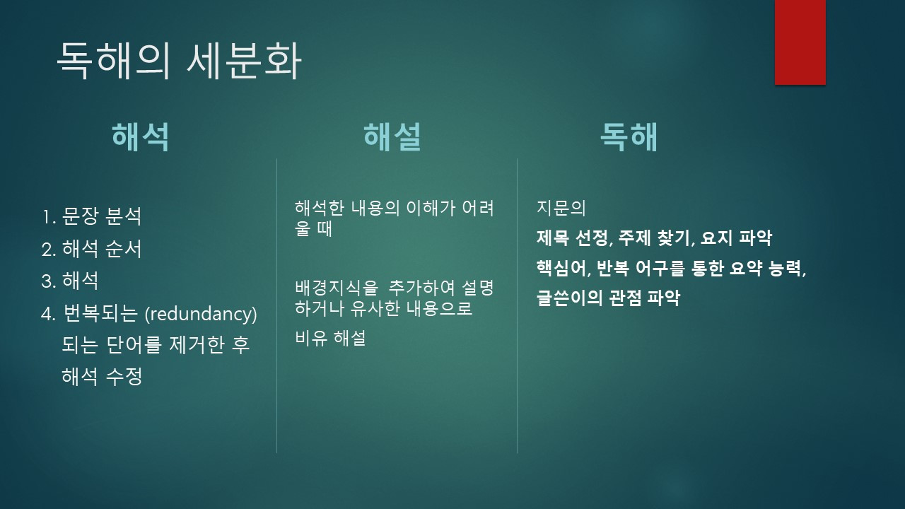 따라서 진정한 독해의 향상을 위해서는 독해를 좀 더 세분화시켜 단계가 있음을 인식하는 것이 선행되어야 한다.
