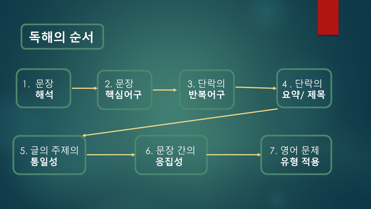 이와 같이 독해 향상을 위해 해결해야 할 숙제를 하나하나 해결해보자.. 1) 해석 - 2) 문장 핵심 어구 찾기 - 3) 문단 반복 어구 찾기- 4) 요약/제목 정하기 -5) 주제의 통일성 - 6) 문장 간 응집성 - 7) 문제 유형 적용