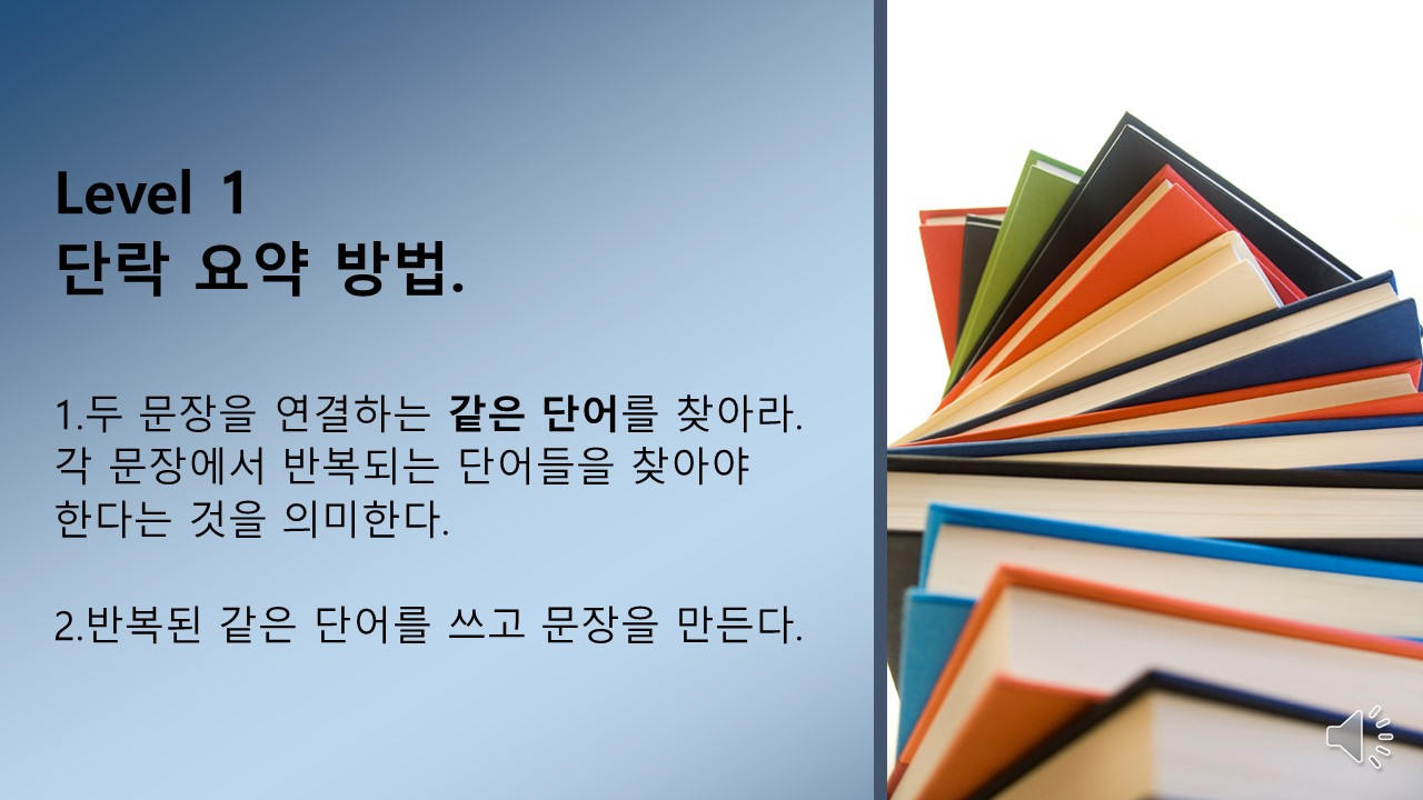 자신이 읽은 글을 스스로 요약할 수 있는 힘을 길러주고 그 후에 책을 읽게 한다면 그 읽은 이야기마다 기억 속에 누적이 되어 지식이 생기고 그 지식을 바탕으로 생각하고 말하고 글을 쓰게 될 것이다. 결론적으로, 기억에 남는 독해 학습의 첫 단계는 한 단락 요약하기이다. 그중에서도 첫 단계 '같은 단어 종합하여 요약하기'를 가지고 적어도 20개 이상의 지문을 훈련해 봐야 한다.