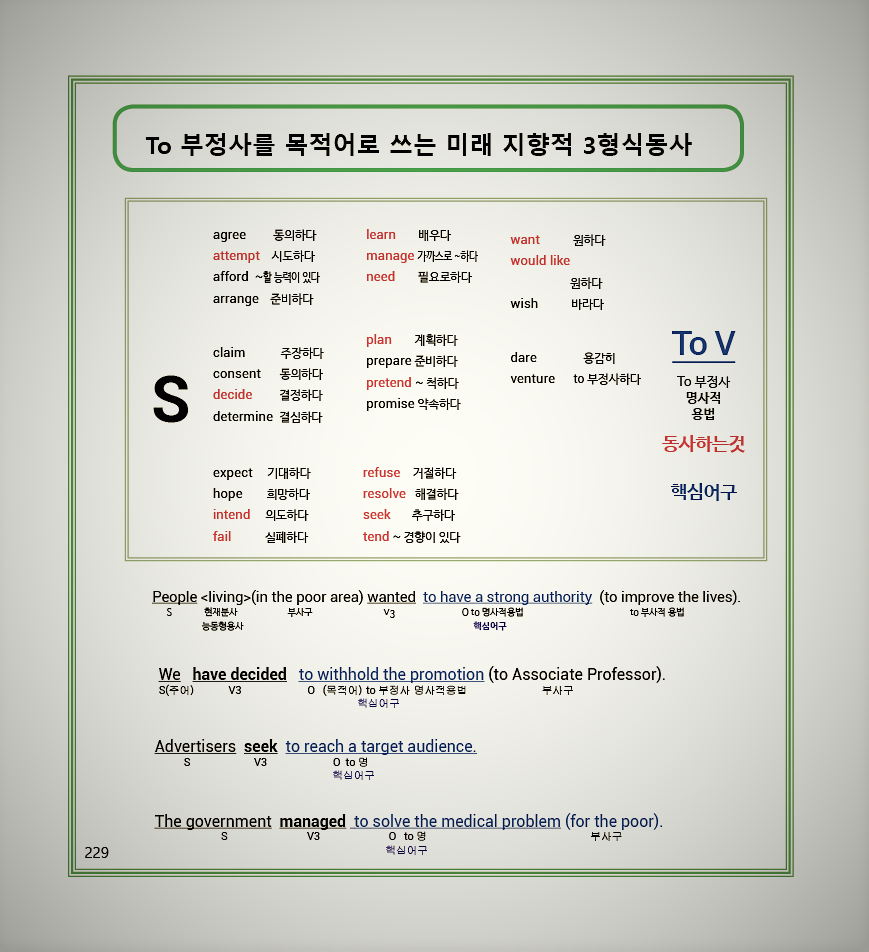 위의 그림에서 보는 것처럼 3 형식 미래지향적 동사 뒤의 to 부정사가 목적어 자리에 쓰인다. want, decide, seek, manage 등의 동사 뒤의 to 부정사는 문단 전체의 주제일 가능성이 매우 높다. 해석을 통한 내용 이해로 주제를 찾을 수도 있지만 문법을 통한 문장 형태로 주제를 찾는 것이 더욱 객관적이고 정확한 방법이다. 그러므로 to 부정사가 문장 구조에서 어떻게 쓰이고 문장 안에 어느 위치에 있는지 확인할 수 있는 능력이 곧 독해의 능력이 될 것이다.