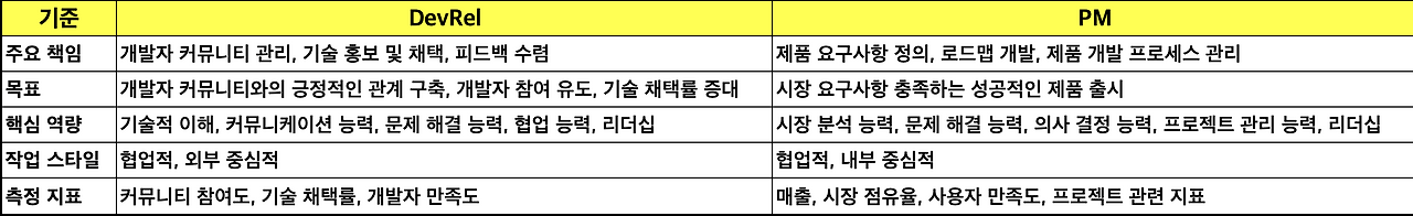 DevRel (Developer Relations)과 PM (Product Management)은 모두 소프트웨어 개발 분야에서 중요한 역할을 하지만, 서로 다른 책임과 목표를 가지고 있습니다. DevRel은 개발자 커뮤니티와의 관계를 구축하고 유지하는 데 중점을 둡니다. 반면, PM은 제품 개발 프로세스를 관리하고 성공적인 제품 출시를 책임집니다. 주요 차이점을 표로 정리 해보았습니다.