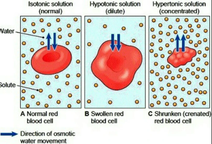 위의 그림 에서 노란 알갱이들을 소금이라고 생각하면, 정상적인 상태에서는 적혈구 안의 소금 농도와 체액의 소금 농도가 비슷해, 적혈구 안에 들어오는 물과 나가는 물의 양이 비슷하다.