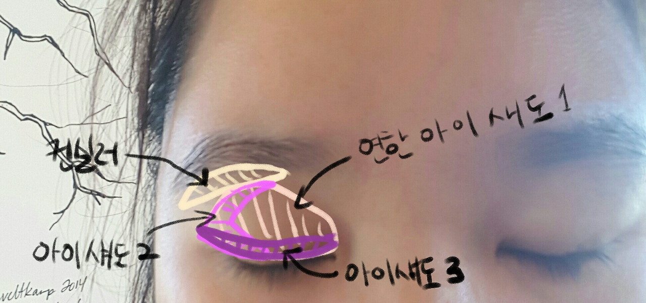아이 섀도우는 팔렛트와 단품을 번갈아 가며 사용해 아래 사진처럼 발라주었는데 컨실러로 눈썹 아래를 정리해주고 아이프라이머 위에 연한 섀도 1을 넓게 펴바른후 < 자 형상으로 진한 섀도 2를 발라준 후 아이라인을 그리듯 더 진한 퍼플 섀도 3 발라주었다.