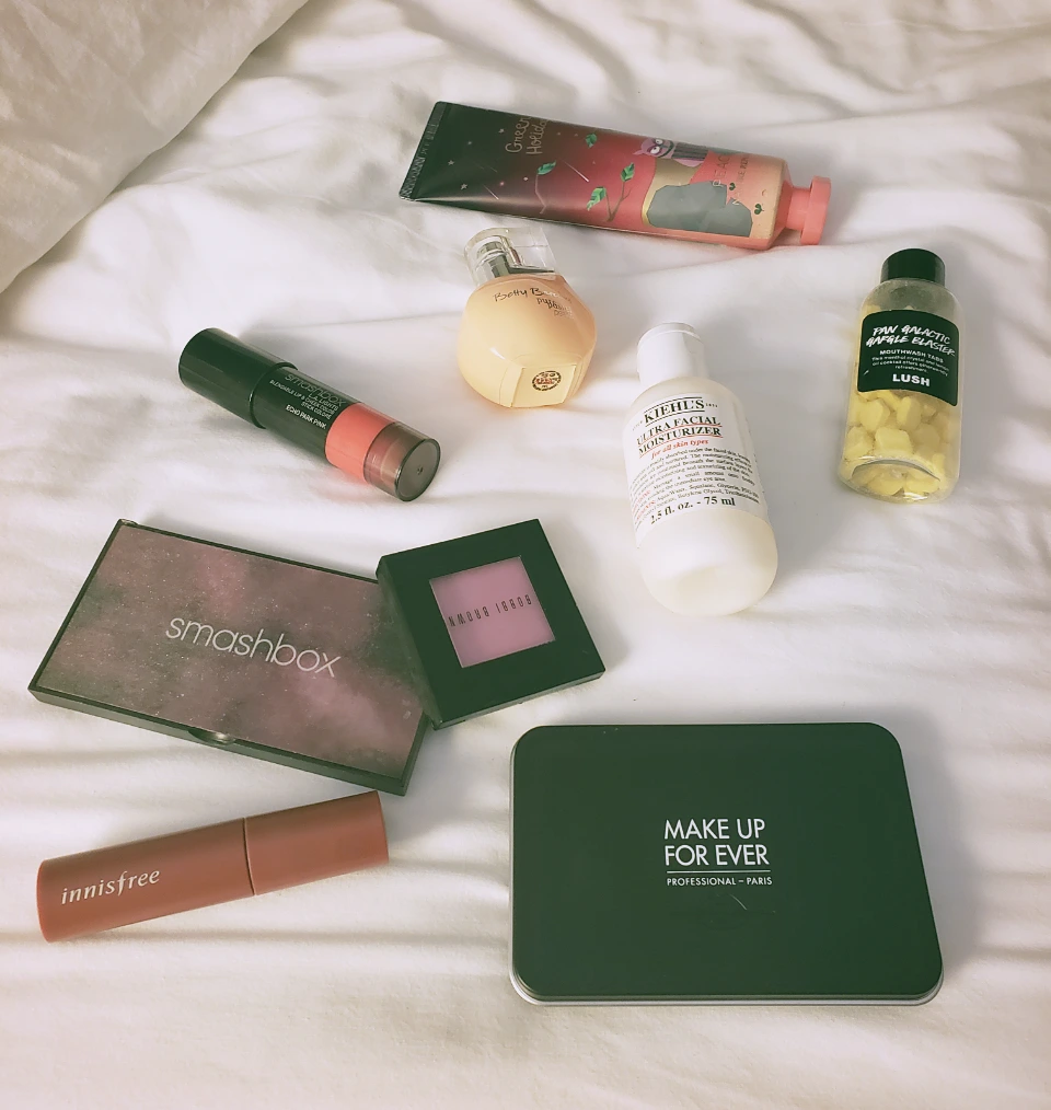 좌측 하단)이니스프리 립글로즈, 스매쉬박스 아이섀도우, 바비브라운 볼터치, 스매쉬박스 립&볼터치, 독일에서 산 향수, 키엘 로션, 러쉬 고체 마우스워시, 메이크업 포에버 파운데이션