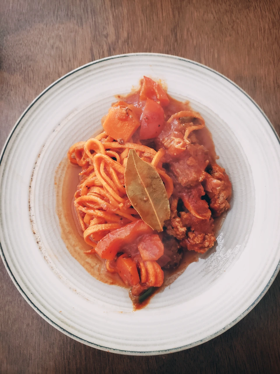 부엌에서 큰 도마와 자주쓰는 식칼을 꺼냈다. 당근과 양파, 그리고 빨간 파프리카를 비슷한 크기로 덩어리감 있게 썰고, 방울 토마토도 한주먹 꺼내 반으로 잘라두었다. 냉장고에 묵혀둔 스파게티 소스도 꺼냈다. 깊이가 깊은 팬을 꺼내, 소금과 후추만으로 버무린 갈은 비프를 한 숟갈의 올리브유와 볶고, 장을 봐온 월계수 잎도 두장을 넣었다. 맛있는 고기 냄새가 올라올 즈음 스파게티 소스를 붓고, 준비해둔 얌 누들과 썰어둔 야채들을 소스가 스며들도록 끓였다. 제법 스파게티의 태와 향이 난다.