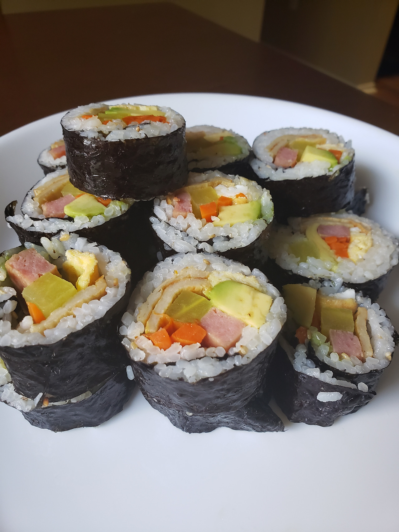 이제는 팔았지만 미국 조지아 본가에 살적에는, 주말이면 엄마는 김밥을 말아두셨다. 냉장고 속 묵은 재료 정리겸, 있으면 있는대로 없으면 없는대로 맛있는 김밥을 만들어 부엌에 썰어 놓고 랩을 씌워두시면 나는 오며가며 쏙쏙 다 집어먹었다. 다행이다. 이렇게 요리 잘하시는 엄마 딸로 태어나서.내게는 엄마의 요리에 대한 이런 행복한 기억들이 가득해서.