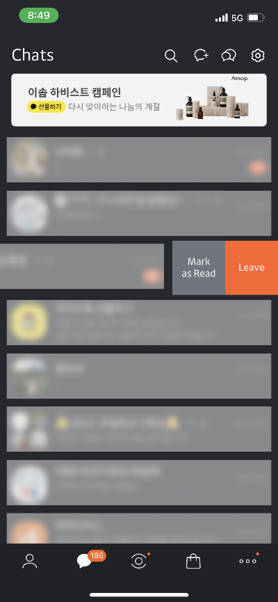 예를 들어 카카오톡 채팅창에서 스와이프를 했을 경우에 ‘채팅방 삭제’가 아닌 ‘읽음으로 처리’와 ‘채팅방 나가기’ 옵션을 확인할 수 있습니다.