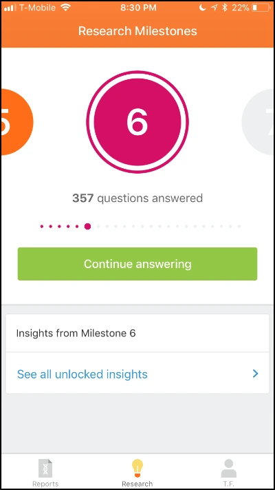 짧게 만들어서 부담을 적게 하고 끝나자마자 사용자에게 답변한 질문 수를 보여주면서 '이어서 대답하기' 버튼을 노출해요. 이미 설문 조사를 진행하고 있었던 사람들은 더 많은 설문조사 질문에 답변을 하게 되죠. '나는 지금 설문 중이야'라는 이 서비스와의 약속을 지키고 싶다는 심리를 이용하는 거예요.