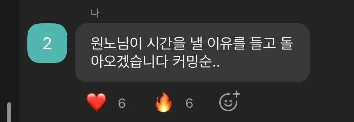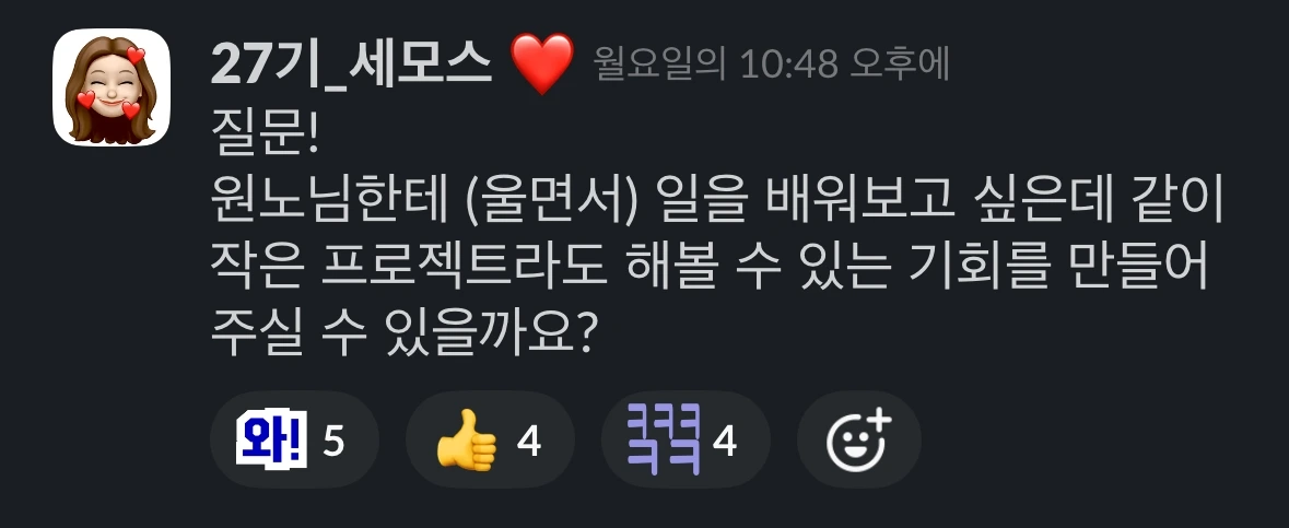 이미지에서 볼 수 있듯이 함께 고민상담소를 듣던 다른 멤버분들이 응원의 마음도 전해주었다. 도대체 무슨 이유를 들고 갈 수 있을지 아직 1도 모르겠지만 가슴이 뜨거워졌다.