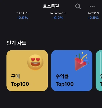 내가 Vibe 음악 앱을 켰나? '인기 차트', '구매 Top 100', 눈이 하트 뿅뿅인 아이콘, 축포 아이콘... 아래로 스크롤하면 세상 힙한 음악 서비스 Vibe 앱처럼 '좋아할 것 같아서' 주식 믹스테이프가 나올 수도 있다는 생각을 했어요. 개인적으로 첫 투자자들의 눈높이에 맞췄다는 설명만으로는 이해하기 힘든, 그러니까 탈권위주의적이고 탈엄숙주의적인...아니 사실은 투자에 대한 희화화가 느껴졌습니다.