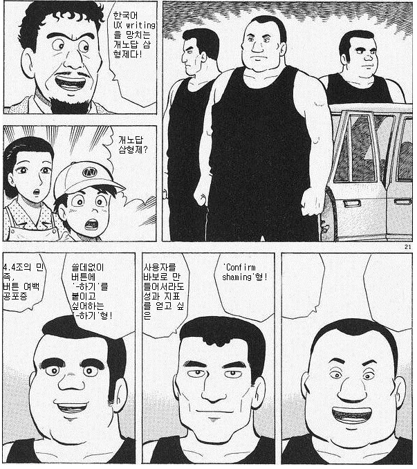 아무튼 오늘 2편에서는 큰 형과 다르게 호불호, 취향 존중과는 전혀 상관없는, 그러니까 자신 있게 쌍소리 호통을 칠 수 있는 문제에 대해서 써보려고 해요. 한국어 UX writing 개노답 삼 형제 중 둘째 형은 사용자를 구석으로 몰아서 서비스의 이익을 추구하는 대표적 다크 패턴(dark pattern), 컨펌쉐이밍(Confirmshaming)입니다.