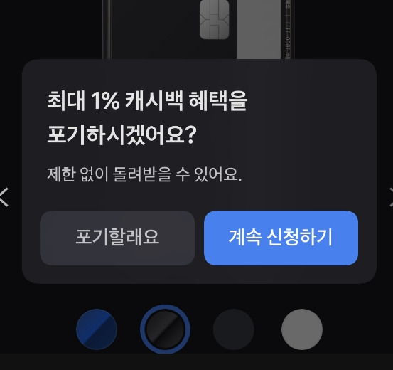 모 금융 서비스에 카드 신청을 하다가 중간에 그만두고 나가려고 할 때 나오는 팝업입니다.