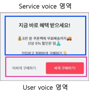 이건 다음 글과 앞으로 Voice and Tone 디자인에 대해 말할 때 자세히 이야기할 개념이지만, 오늘 조금만 이야기해 볼게요. 보통 UX writing 개론서에서 Voice and Tone 디자인을 한다고 할 때에는 서비스의 목소리, 즉 공급자의 목소리를 어떻게 설정할 것인가에만 초점을 맞춥니다. 하지만 UX writer 가 디자인해야 하는 보이스는 하나가 더 있습니다.