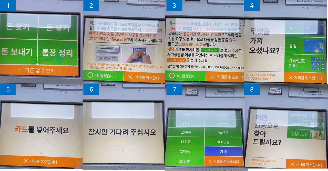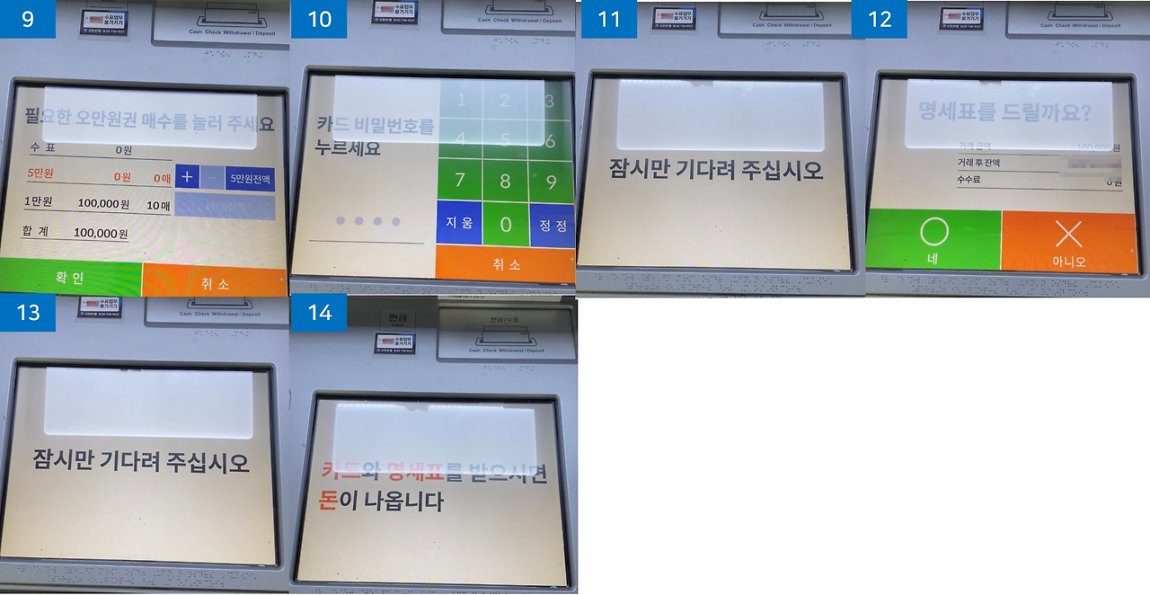 가장 대표적인 돈 찾기(출금) 플로우를 찍어봤습니다. 입금, 출금, 송금, 통장 정리 모두 예상하시는 플로우일 것입니다. 동영상을 캡처한 거라서 잘 안보이실 수 있지만 대략적으로 이런 흐름이니까 화면 구성, 글자 크기, 텍스트만 슬쩍 확인해 주세요.