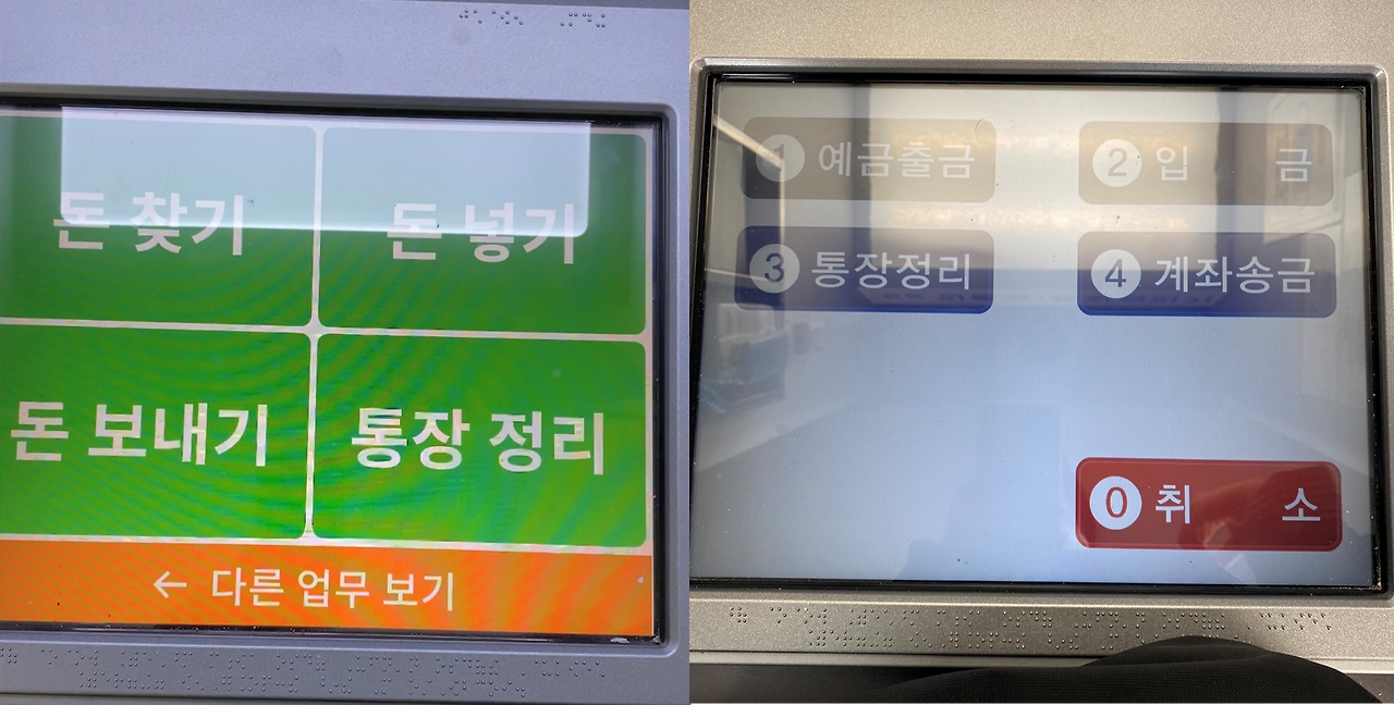그런데 저시력자들이나, 노인, 어린이 등 금융 서비스를 이용해 본 적이 없던 초보 사용자들에게는 이런 ATM 사용이 어려웠기 때문에 간편 거래나, 화면 확대 서비스를 추가로 ATM 화면에 탑재하게 됩니다.