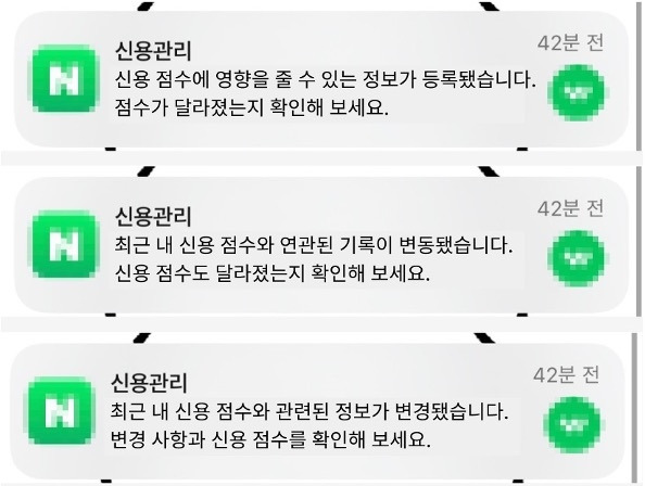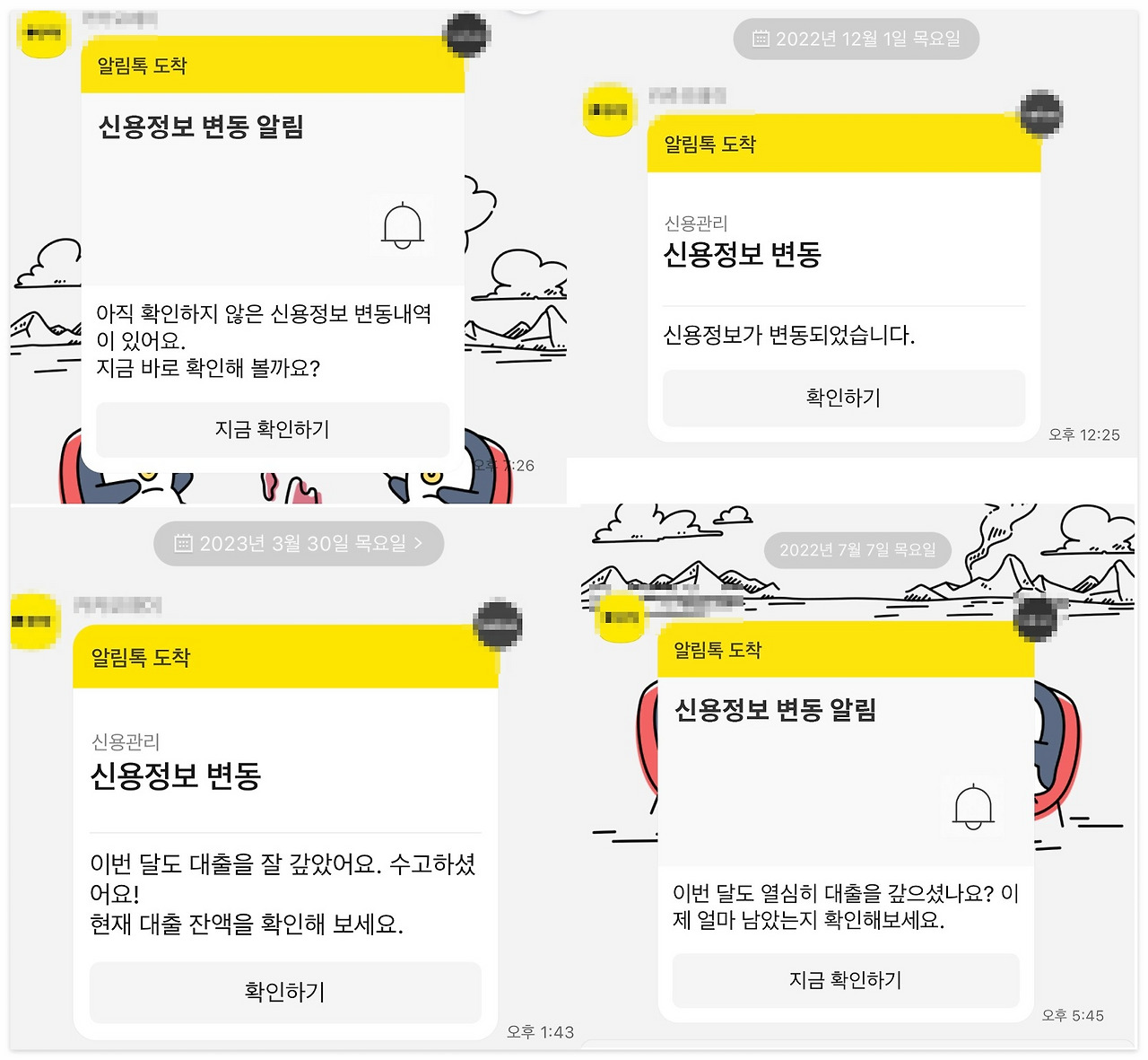 제가 대출을 좀 세게 받은 상태고(...ㅠㅠ) BM을 위해서 여러 회사의 신용 정보 서비스에 가입을 한지라, 꽤 여러 서비스로부터 매월 신용 정보 변동 메시지를 거의 일 년 넘게 받고 있습니다. 요즘은 좀 뜸한데 그동안 매달 때가 되면 각 서비스의 푸시 메시지의 향연을 구경하는 재미가 꽤 쏠쏠했다 이 말입니다.