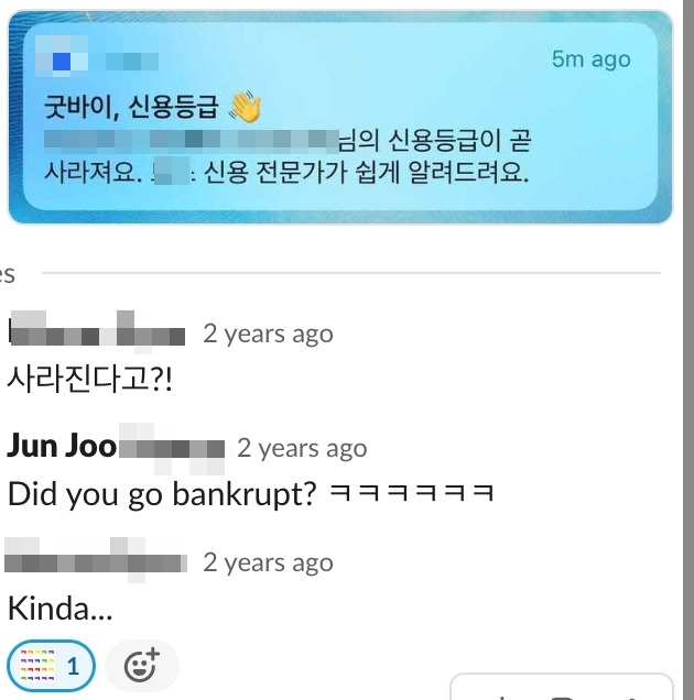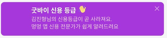그러고 얼마 안 있어서 제게도 같은 푸시 메시지가 왔습니다. Joo Jun님의 신용 등급이 사라진다고요.