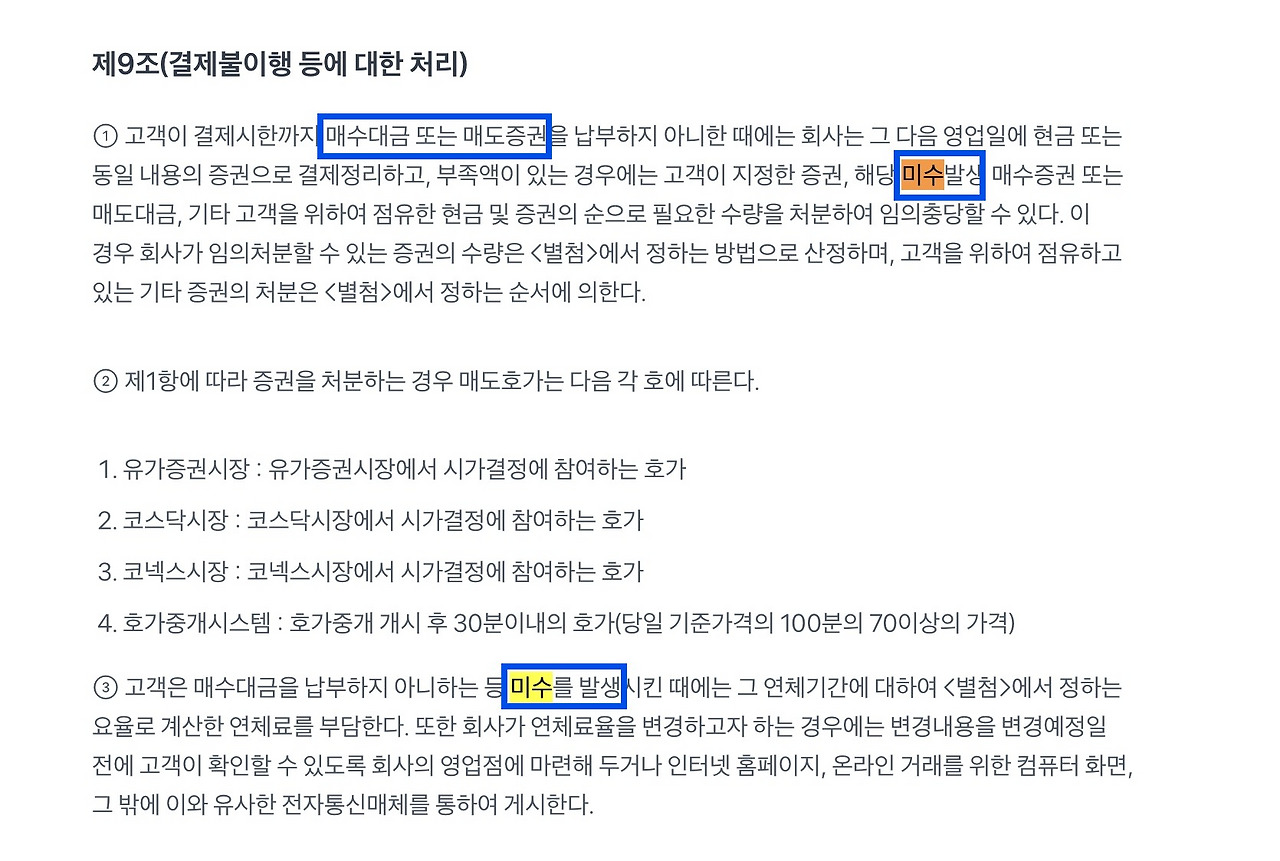 금융거래란 결국 약관에 근거해서 운용되고, 분쟁이나 갈등이 생기면 이 약관을 기준으로 잘잘못을 가리게 됩니다. 그런데 이 약관은 표준약관이라서 증권사가 임의로 건드릴 수가 없죠. 이번에 금감원이 지적한 부분 중 하나가 이 부분입니다. 또 '외상’이란 단어는 자본시장법이나 금융투자업 규정에 있는 말도 아니니까 더욱 문제가 되었죠.