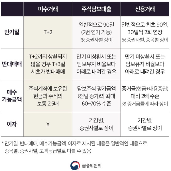 미수거래를 외상구매로 치환할 수 없는 또 다른 이유는 주식 거래의 세계에 또 다른 레버리지 거래가 존재한다는 것, 즉 '신용거래'와 '주식담보대출' 같이 돈을 빌리는 다른 거래가 있다는 것입니다. 이들 빚투의 차이점은 아래 금융위원회 표를 참고하세요.