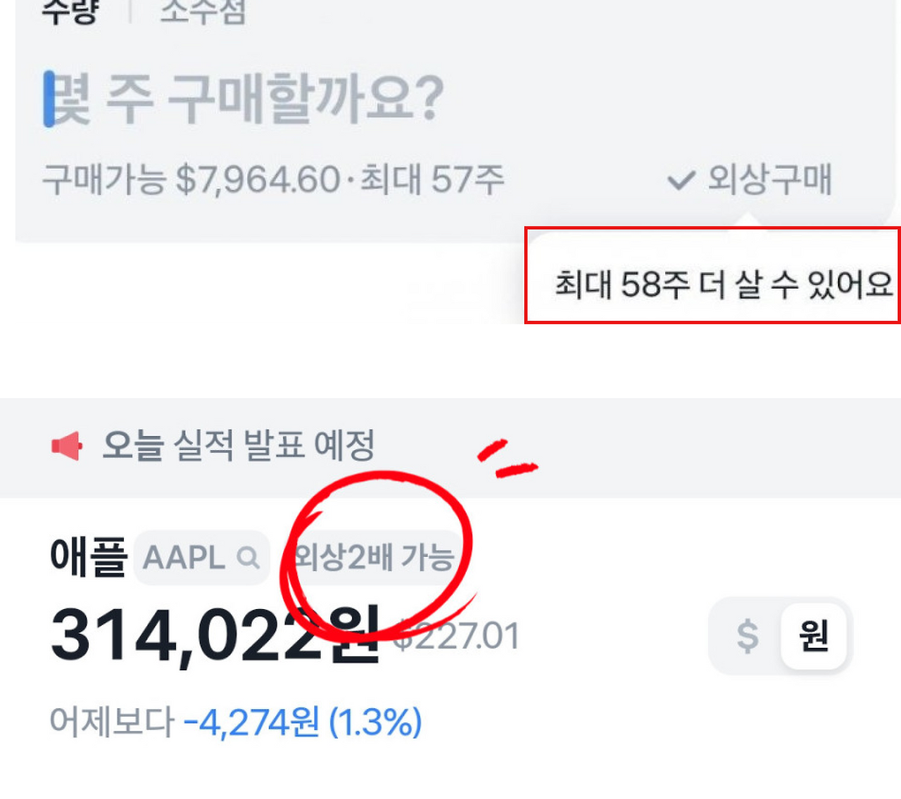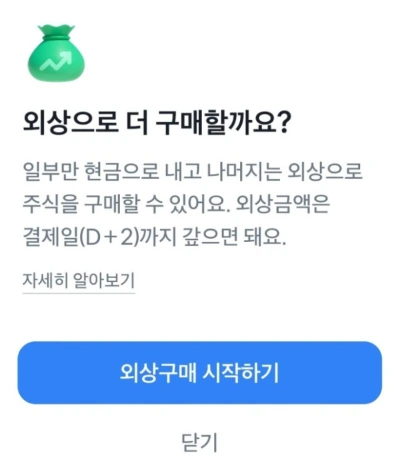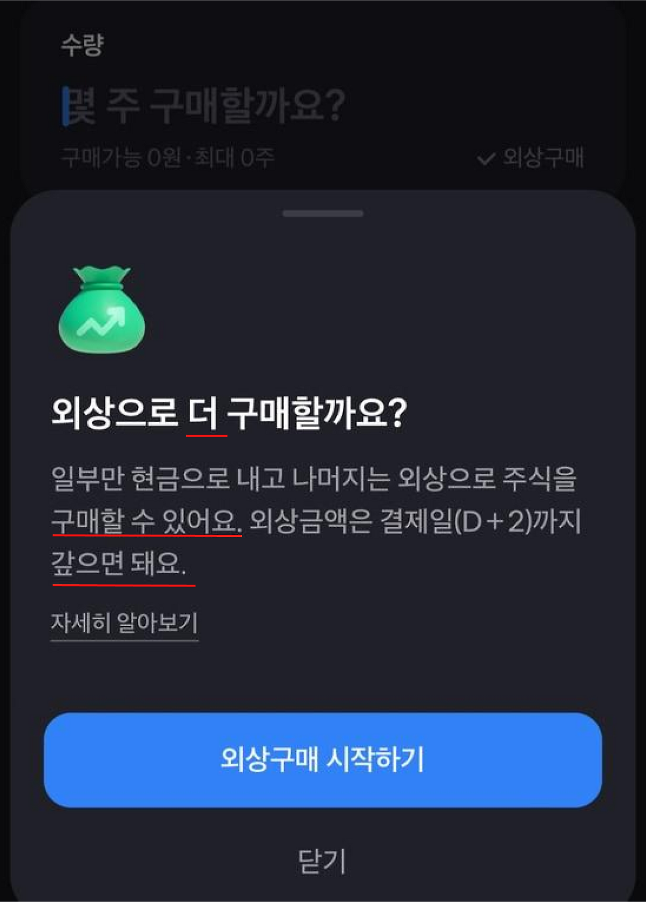 그 아래 디스크립션은 더욱 노골적인데 '일부만 현금, 나머지는 외상으로 살 수 있어요. 외상 금액은 ~일에 갚으면 돼요'처럼 긍정형(돼요)과 가능형(~수 있어요)이 충만합니다. '최대 % d주 더 살 수 있어요', '외상 2배 가능'과 같은 표현에서도 빚투 욕망을 펌핑하는 강한 기운을 느낄 수 있죠.