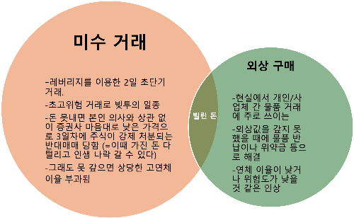 보시면 알겠지만 두 용어 사이의 교집합은 '빌린 돈으로 주식한다'는 거 말고는 없습니다. 현실 세계에서 가끔 쓰이는 외상구매라는 용어는 다소 소소하고 약간은 구차한 행위(구멍가게에서 라면 값 달아놓고 월급날에 갚는 애잔한 느낌...)를 의미하는데, 이는 미수거래가 갖고 있는 초고위험도 거래의 의미를 조금도 포괄하고 있지 못하죠.