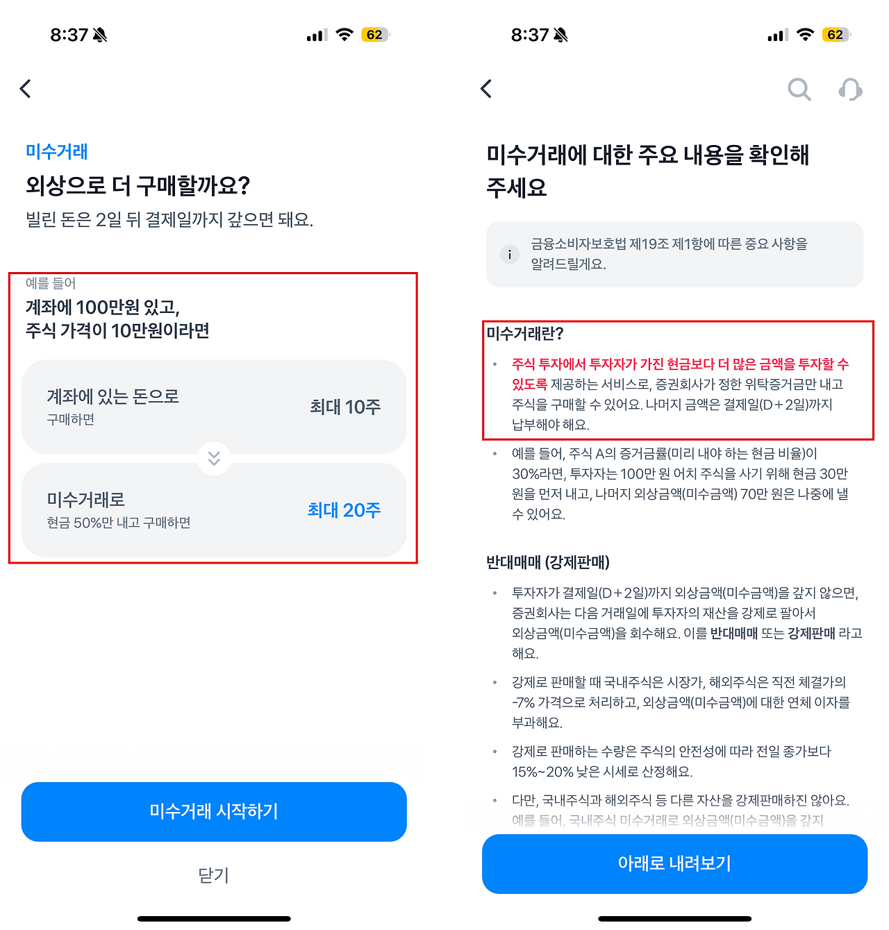 또, 미수거래에 대한 주요 내용을 알려주는 이후의 상세 페이지의 빨간 볼드 글씨는 원금 손실이나 미수거래의 위험성에 적용된 것이 아니라 '가진 현금 보다 더 많이 투자할 수 있도록'에 적용되어 있습니다.