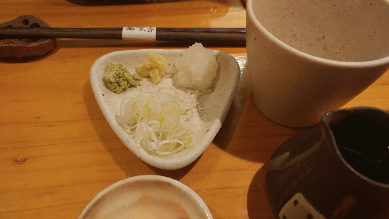 수타 히야무기는 얇고 투명합니다. 찐뜩찐뜩 약간 엉켜 있는데 갈색의 연한 쯔유에 살짝 담그면 풀어지면서 쫀득하고 맛있어져요. 안먹어본 맛이라서 약간 놀랐습니다. 소면인데 소면 같지 않은 너.