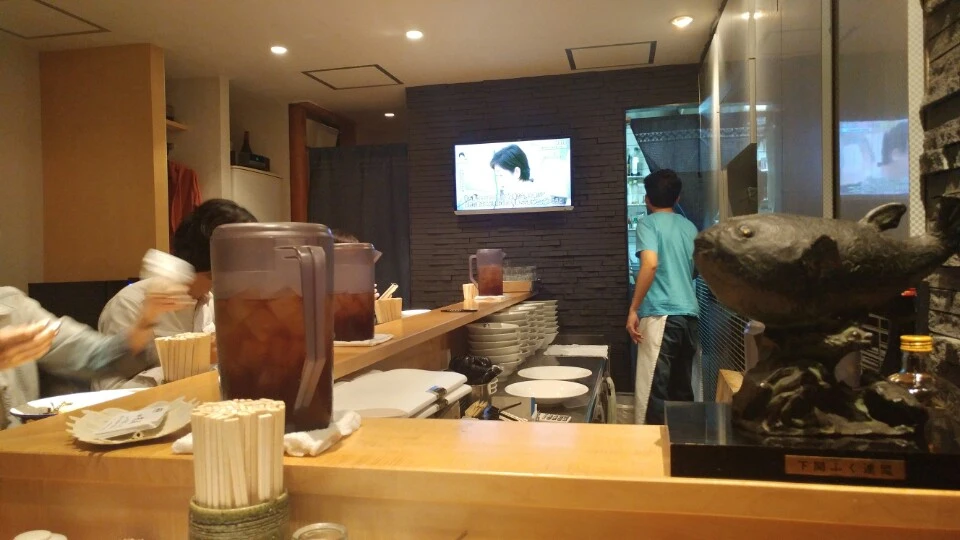 들어가자 바 자리에 사람들이 쭈욱 앉아 있고, 한쪽 벽면엔 TV가 켜져 있습니다. 모두 라면을 먹으며 TV를 보고 있네요.