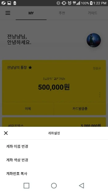 카카오 뱅크의 메인 페이지에서 계좌 설정 아이콘을 터치하면 나오는 다음 바텀 시트를 보자.