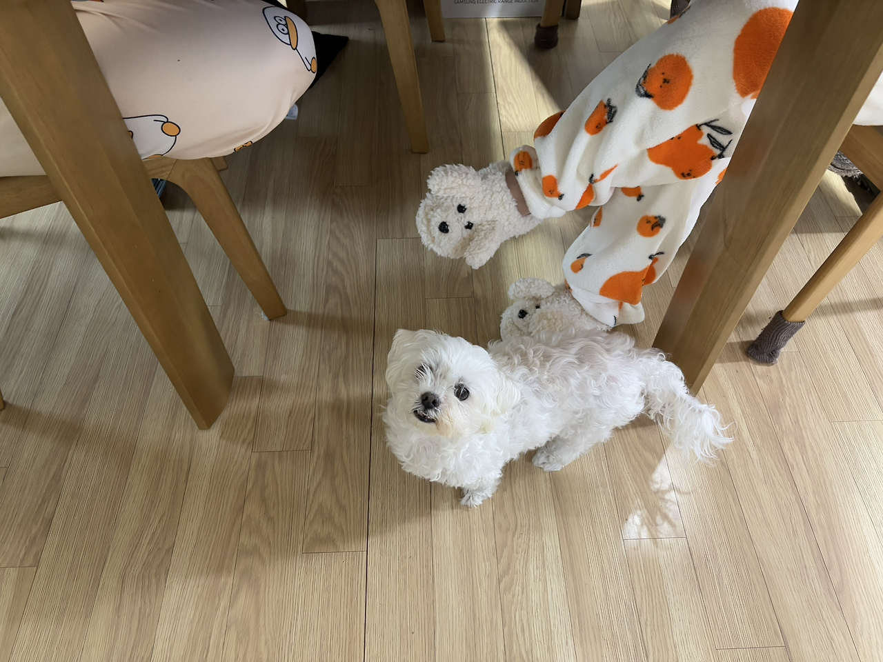 정말 귀여워서 엄마와 동생에게 사랑이 좀 보라고 했지만 의자에 앉아 있으니 식탁 상판에 사랑이가 가려져 제대로 보지 못했다. 내가 찍은 사진을 보여주니 엄마가 웃었다. 귀여운 모습을 나만 직접 봤다.