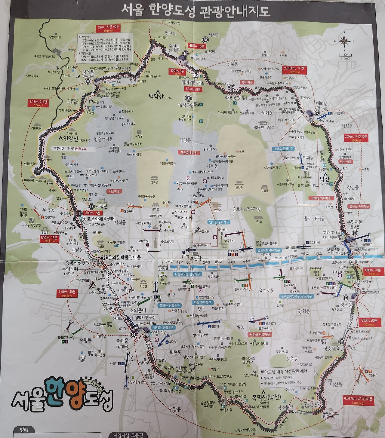 늦었고 촌스럽지만 한양 도성 길을 걸으면서 내가 사는 도시의 과거를 걷는 여행을 하였다. 한양 도성은 조선 왕조(1392~1910)의 도읍지인 한양을 외부 공격을 방어하기 위해 쌓았던 5~8m 높이 성벽이다. 경복궁을 중심으로, 동서남북으로 낙산, 인왕산, 목멱산(남산), 북악산 능선과 그 사이 평지를 연결하였다. 성벽 길이는 18.6 Km이며 근대 도시화 과정에서 일부 훼손되어 현재는 전체의 70%(약 13 Km) 구간이 남아 있다. 출입을 위해 성벽 사이에 사대문과 사소문, 모두 8개의 성문이 있다. 사대문은 흥인지문(동대문), 돈의문(서대문), 숭례문(남대문), 숙정문이고 사소문은 광희문, 서소문, 남소문, 창의문이다. 돈의문, 서소문, 남소문은 소실되었고 터만 남아 있다. 나는 혜화문을 출발하여 시계 방향으로 도성 길을 2번 나누어 걸었다. 한양 도성길 안내 지도에 4개의 산을 기준으로 각 구간의 거리, 소요 시간, 진입지점 교통편이 잘 정리되어 길치인 나도 헤매지 않았다.