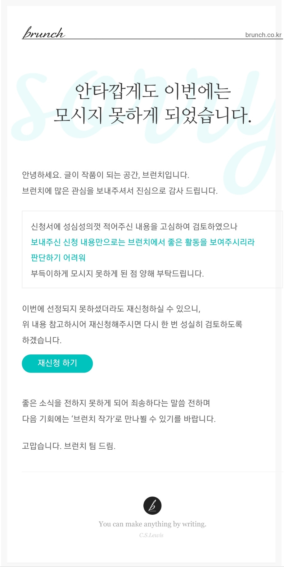벌써 다섯 번째다. 브런치 작가 신청을 지금까지 계속해왔지만, 번번이 떨어지고 말았다. 이번 결과도 마찬가지다. 브런치를 알게 된 건 약 두 달 전이다. 예전에 몇 번 들어본 적은 있으나, 정확히 어떤 플랫폼인지 잘 몰랐다. 그러던 어느 날, 아는 선배가 브런치에 올린 글을 보았다. 선배의 글을 읽으면서 다른 사람들도 이곳에 글을 쓰고 있음을 알았다. 브런치를 자세히 둘러보니, 평소에 글을 읽고 쓰기를 좋아했던 나에게 그야말로 신세계였다. 내가 원하는 관심사의 글도 여럿 있었다. 한 치의 망설임도 없이 브런치 애플리케이션을 다운로드하고 가입했다. 그렇게 나와 브런치의 만남이 시작되었다.