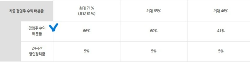 가령 기본 배분율 66%에서 24시간 영업장려금 5%를 합한 71%가 기본 배분율이지만, 해당 점포가 고매출이 나올 가능성이 있다면 본사에서는 어떻게든 더 가져가고 싶은 니즈가 강하기 때문에 일시장려금 형태로 몇 천만 원을 지급하기도 하며, 배분율 또한 71%가 아닌 80% 이상을 제시하게 됩니다. 제가 상담한 분의 경우 가장 높은 배분율을 받은 분은 90%입니다.