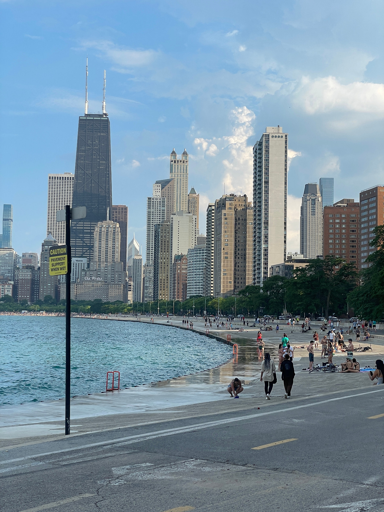 개인적으로 시카고의 여름을 가장 잘 느낄 수 있는 곳은 Michigan Lake라고 생각한다. 1년의 절반을 매서운 추위 속에 웅크려야 했던 상황에 맺힌 한을 표하듯여름에는 새벽부터 저녁까지 수 많은 사람들이 호수변을 따라 조깅, 자전거, 비치발리볼, 수영 등의 야외활동을 즐긴다. 우리 집은 Michigan Lake까지 두 블럭 거리의 초 접근성을 자랑한다. 화려한 명품거리를 두 블럭만 지나가면 푸른 호수의 또다른 세상이 펼쳐지는데, 이 축복된 주변 환경을 최대한 이용하고자 매일 저녁 일과를 마치고 조깅을 한다. 조깅을 마치고 벤치에 앉아 땀을 식히는 시간은 아주 다양한 사색을 불러일으킨다. '오늘도 보람차게 살았다'라는 나에 대한 격려 및 자아성찰, Lake에 있는 수많은 사람들에 대한 궁금증, 얼마남지 않은 시카고 생활의 아쉬움, 또는 그저 멍하니 아름다운 풍경을 감상하다 보면 어느새 밤이 찾아오기 시작한다. 이 아름다운 풍경을 사진으로 담고 싶지만 사진으론 해변가 사람들의 역동성을 담기에는 충분하지 않은 것 같다.