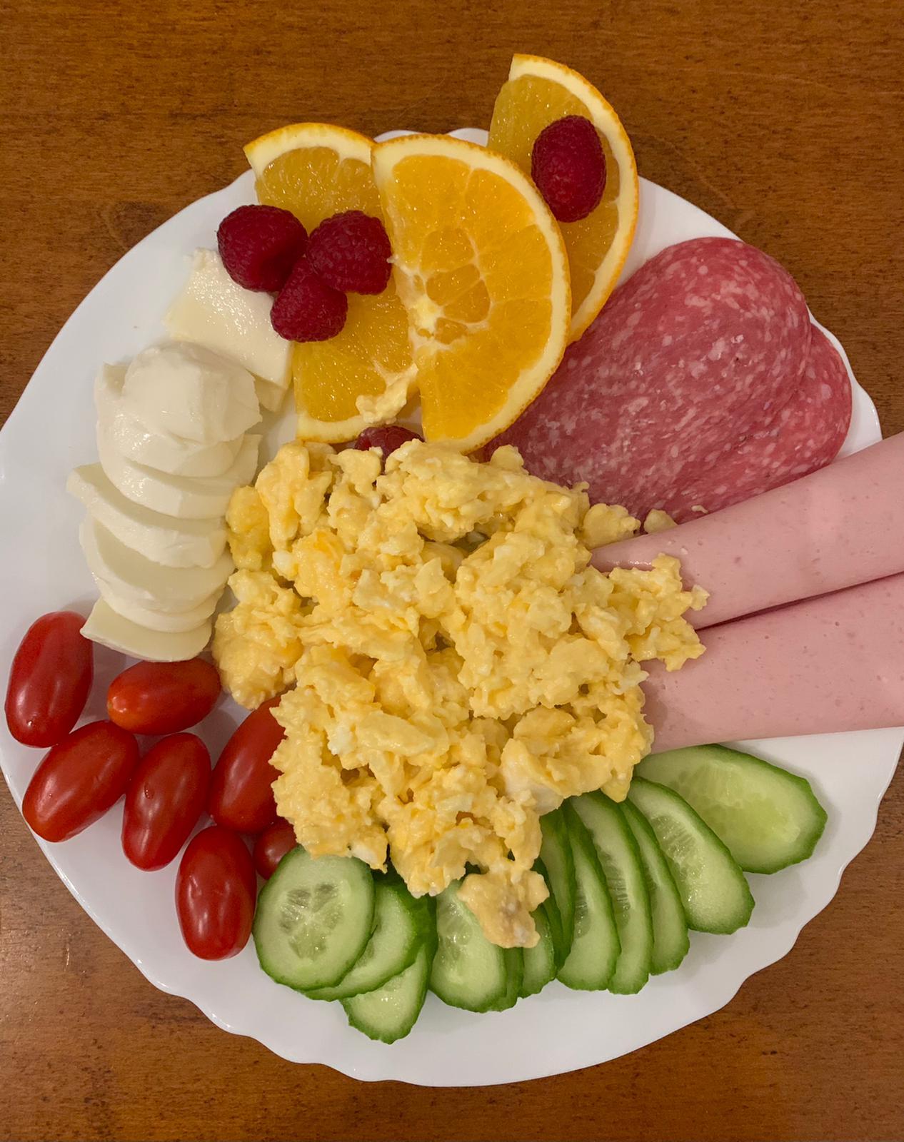우리는 아이가 좋아하는 노란 에그 스크램블과 색깔 맞춰 썰어 담은 초록색 오이, 빨간 방울토마토 , 하얀 모자렐라 치즈 오렌지빛 달콤한 오렌지와 빨강 베리, 빵에 넣어 먹을 햄과 살라미를 접시에 돌려 담고 갗구워낸 빵과 크림지츠, 빵에 바르는 아몬드 크림을 두고 정다운 아침 식사를 했다.