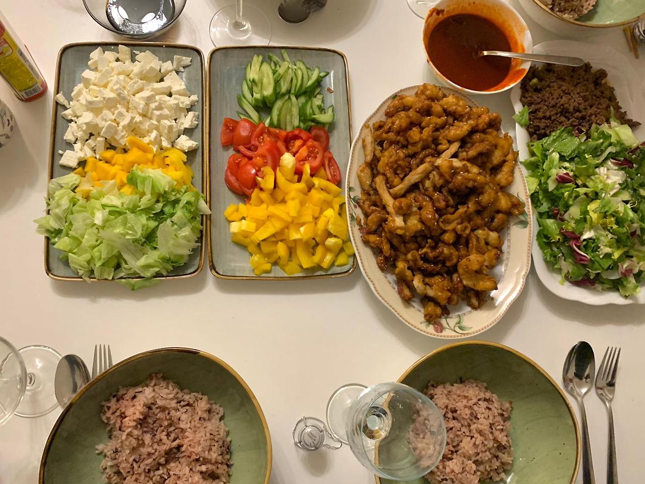 어쨌거나 비주얼은 우리의 비빔밥과 큰 차이가 없으나 들어가는 토핑 재료가 조금 더 다양한 와이키키 포키 볼.. 딸내미 생일 상에 오른 우리 집 포키 볼 에는 페타 치즈, 망고, 양상추, 오이, 토마토, 피망, 적양파, 루꼴라, 샐러드용 미니 상추, 불고기 양념한 쇠고기 볶음 그리고 바싹 하게 튀긴 돼지고기를 간장 양념에 빠르게 조려 낸 깐풍기 도 토핑으로 쓰였다.