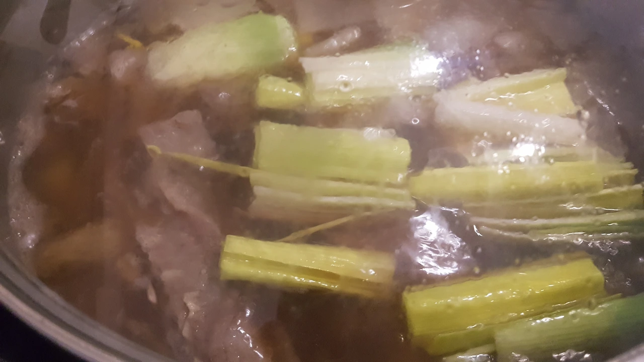 큰솥에 갈비 넣고 찬물 부어서 끓이면서 하얀 무 숭덩숭덩 넣고 초록색 파도 길게 썰어 넣고 동글동글한 통마늘 여섯일곱 쪽, 엄지 손가락 만한 생강 한쪽 , 그리고 통양파 하나, 사과 한 개 넣고 중간 불에 뭉근히 끓인다.
