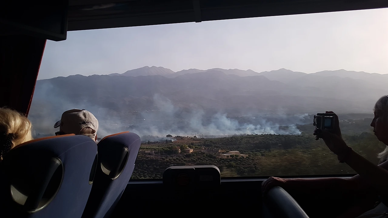 여기 저기 한무데기 서있던 사람들은 혹시나 정차해둔 버스들의 기사 아저씨 들은 뭔가 방법이 있을까? 싶어 몰려가 물었고 사람들의 성화에 여기저기 전화를 넣던 기사 아저씨들은 더운 날씨에 메마른 들판에 불이 난 것이라 크레타 섬 전체에 바람 따라 걷잡을 수 없게 퍼지고 있어 헬기가 동원되고 소방차들이 모두 동원되었지만 산불 진화에 애를 먹고 있다는 현장 소식을 전해 주었다.