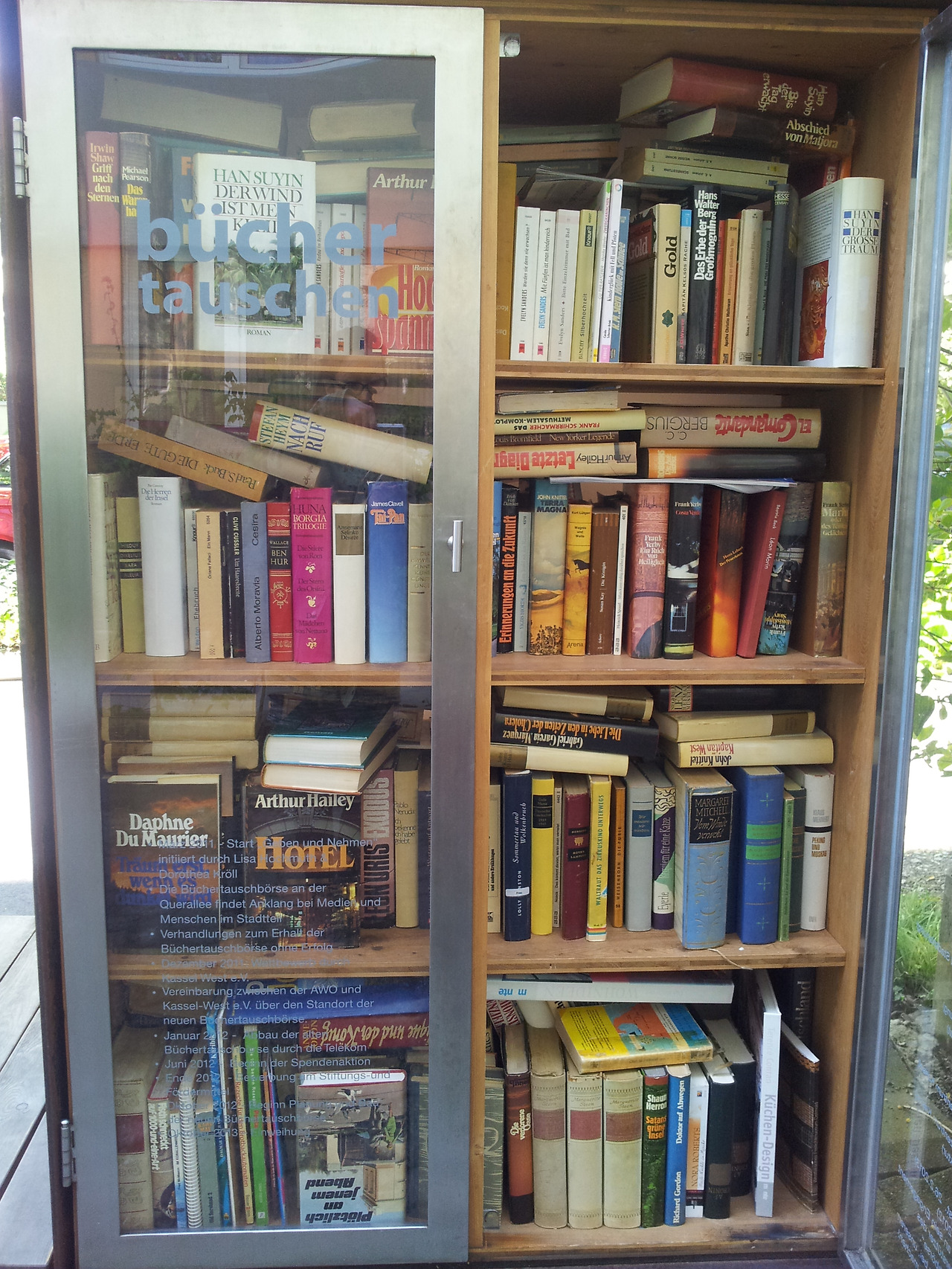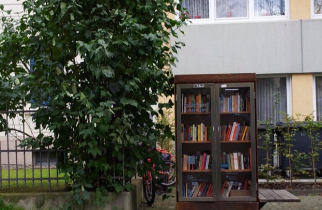무료 책장 하나가 서 있다.