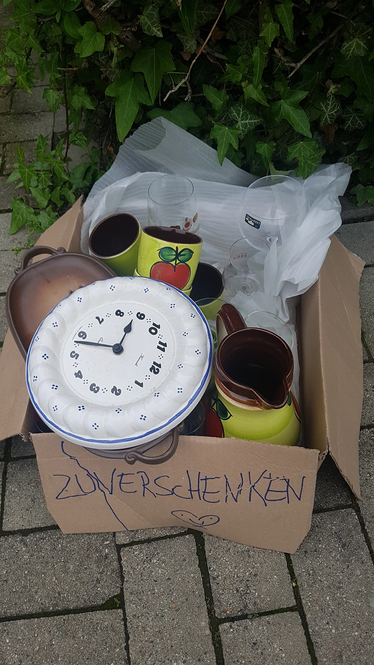 독일에서는 종종 집 앞이나 동네 골목 앞에 저렇게 바구니나 박스 안에 자기는 필요하지 않지만 다른 사람들 중에 혹시 필요한 사람 들이 가져가라고 놔두는 것들이 있다.이때 선물이에요 또는 가져가세요 등의 문구를 팻말로 적어 놓고 놔둔다.