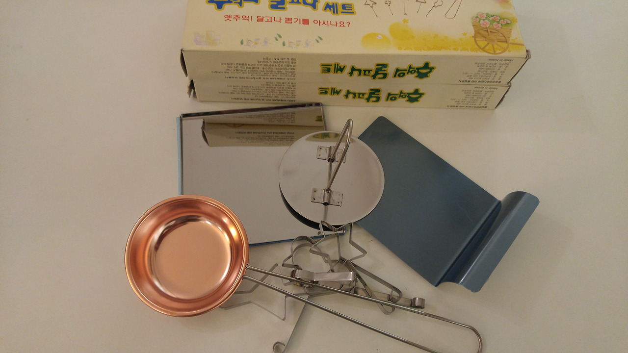 한국에서 들고 온 식소다 도 함께 보여 주며 이 국자에 설탕을 담고 하얀 설탕이 녹아서 갈색의 걸쭉한 캐러멜 이 되었을 때 젓가락에 하얀 소다를 살짝 묻혀서 갈색의 설탕이 고소한 과자 색으로 연하게 변하면서 부풀어 오르고 그것을 판 위에다 부어서 그 위에 모양 틀을 찍고 누르 개로 누르면 그 모양이 굳어지면서 먹을 수 있는 과자가 만들어진다고 말이다.