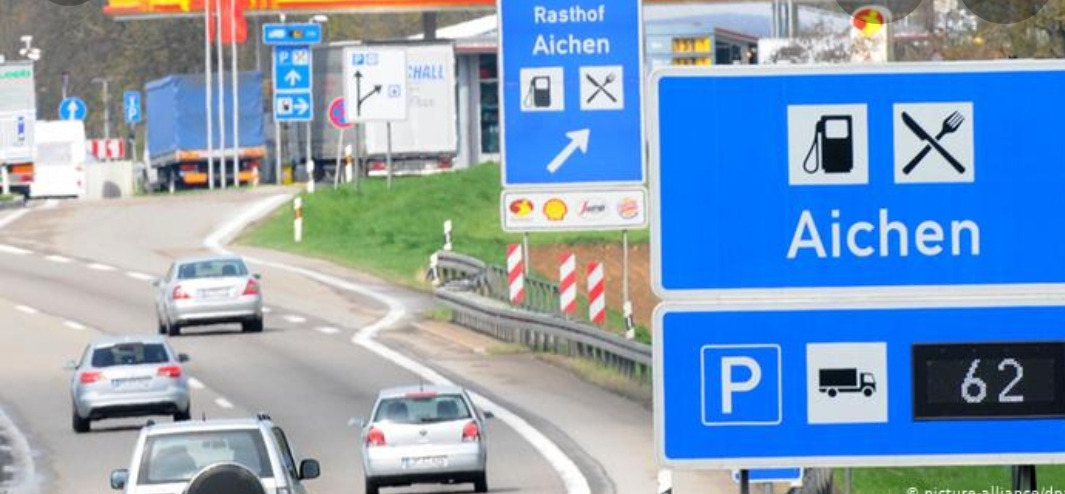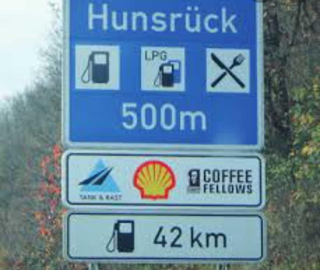 아우토반의 표지판에 휴게소는 주유소를 상징하는 주유통 그림과 식당을 말하는 포크와 나이프 표시가 함께 그려져 있다.