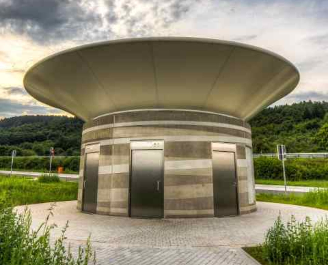 아 이 고속도로 주차장 화장실은 외관도 범상치 않은 것이 기존의 남자 여자 화장실로 입구가 구분되어 있고 칸칸이 나뉘어 있던 휴게소 화장실이나 다른 주차장 화장실 과는 달리 동그란 원형 건물로 생겨 있었다.