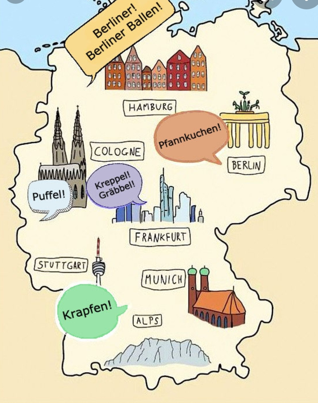 베를린의 이름을 딴 베를리너 도넛이 정작 베를린에서는 베를린 떼고 팬케익으로 만 불리고 우리가 사는 독일 중부에서는 베를리너 또는 크레펠 남쪽에서는 크라펜 , 그리고 서쪽에서는 프펠로 불린다.